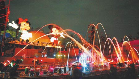 一等主舞台背景音乐响起,轨道两侧的米老鼠主灯,缓缓向舞台中央靠拢,水舞与灯光迸射而出,在漆黑的夜空中令人惊艳,不少民众为此欢呼连连,测试时间约十五分钟。