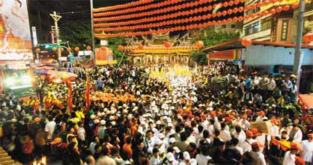 昨天上午9时起,全台各地信众不断涌入大甲镇,将镇澜宫周边街道挤得水泄不通,愈晚愈热闹。大甲警方出动警、民力三百三十人,自下午3时交通管制;县文化局规划大甲妈祖观光文化节,下午6时起安排街头表演,另狮阵、虎阵、艺阁、神偶、阵头及神轿不断聚集镇澜宫,到处人头攒动。