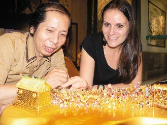 中新网4月11日电 “哇,好漂亮!”法国女雕塑家柯萝荷昨天参观台湾鹿港金雕大师郑应谐的“台湾迎妈祖”金雕作品时,对于细腻而生动的创作表现,看得十分出神,也让她感受到台湾民众“迎妈祖”的热闹气氛。
