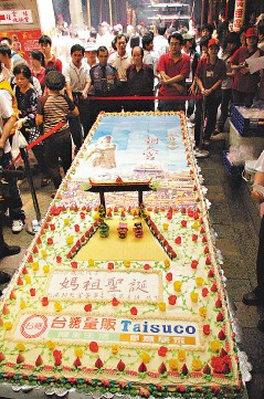 中新网4月28日电 为庆祝妈祖诞辰,台糖北港量贩店昨天特别制作号称全台最大、可供2000人享用的巨型蛋糕,送往云林县北港朝天宫为妈祖祝寿,蛋糕上还有朝天宫庙景,十分特殊。