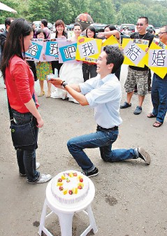 据台湾《联合报》报道,60对新人昨天齐聚蒋介石铜像园区参加“穿越时空遇到爱”集体结婚典礼。新人们牵手步过鹊桥进入会场,个个拼创意,有举牌助婚团,还有顶着爆炸头的新郎倌,连穿自由车车装新人都抢着亮相,让园区里头喜气洋洋。