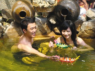 昨天推出的“雄黄酒汤”,在温泉里加入适量的雄黄酒。据介绍,雄黄酒含有三硫化砷,不可多喝,但用来泡澡净身,可以消除疫病,温泉池畔放了一壶雄黄酒,游客还可以沿袭传统,用手指或毛笔沾酒,在额头写一个“王”字,体验古代人驱邪的仪式。