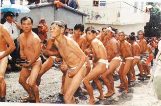 昨天上午10时,东清村年轻人和长老穿传统丁字裤,围绕在拼板舟四周,吟唱祝福歌谣举行“蛮阿威”仪式,只见他们绕着新船瞪眼怒视,双手握拳,在腰际挥动、声嘶力竭的吆喝,双脚用力跺步,增强新船的气势。