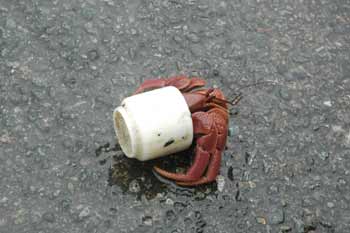 一只被压扁的椰子蟹旁,还有奇怪的酒杯正快速移动,仔细一看,这个白色的小酒杯竟然是寄居蟹,拖着笨重的酒杯,希望尽速横越马路。