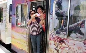 中新网6月19日电 阿里山森林铁路经营权移交首航仪式今天举行,由台当局“林务局长”颜仁德代表与宏都董事长陈弘毅完成铁道交接工作。现场展示创意彩绘列车、蒸汽火车头及桧木车箱,今天首航彩绘班车沿线安排专业导览。