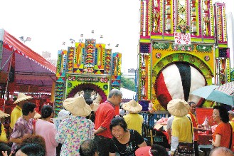 中新网8月11日电 “2008台北县客家文化节”昨天举办压轴的千人挑担奉饭及义民祭祀大典。最特别的是祭典中不可少的神猪,基于人道、环保考虑,客家乡亲这次改用面线、米果、鲜花等素材,扎出创意神猪,取代传统的杀猪竞赛。