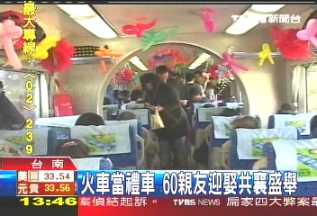 中新网12月8日电 台湾台南有一位铁道迷,为了要完成在火车上结婚的梦想,自掏腰包花了4万多元新台币,包下台铁行政专车,载着60多名的亲友,从树林迎娶新娘回台南林凤营站。火车婚礼堪称台湾史上头一遭,月台上吸引很多乘客目光,也造成轰动。