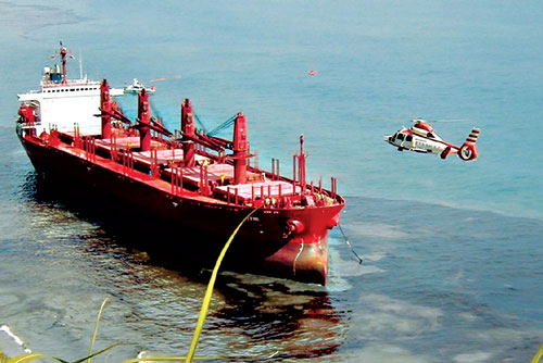 台湾一架直升机正在监控一艘漏油的台湾油船。