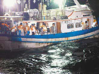 台湾渔船被日本巡逻舰撞沉,船员在沉没前准备逃生。