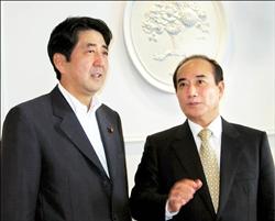 王金平(右)十六日应邀在日本演讲,在演讲会前与安倍晋三(左)会晤