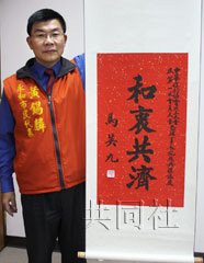 黄锡麟高举马英九赠给“中华保钓协会”的题词。