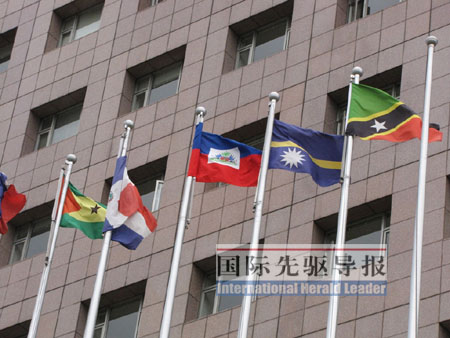 绕到整个大楼正面,才看出还有点“使馆”的派头。大楼前树了一整排旗杆,那些连台湾人也不太认识的各色国旗,从中间向两边依次悬挂。尴尬的是,两边的旗杆上各空出5根,想必十年前还多预留了几根,没想到越用越少了。
