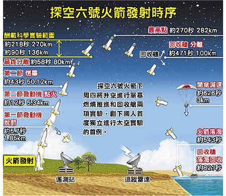 据台湾《苹果日报》报道,台“太空中心”副主任吴岸明5日表示,台湾前五次探空火箭发射执行实验任务都是和海外研究团队合作,这次是台湾首度独立进行太空实验,且采用困难度极高的双酬载(即搭乘火箭升空执行实验的仪器系统)设计,包括与卫星推进关键技术有关的“单基燃烧推进”实验,以及攸关卫星弹射分离技术的“回收舱”实验,两项实验分别由成功大学航空太空工程所和“中央大学”机械系与光机电工程研究所负责设计。