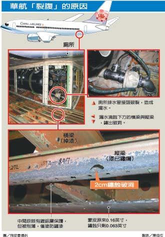 据台湾《联合报》报道,该机除了蒙皮裂痕,机身内部横梁、纵梁都有锈蚀情况,其中连接蒙皮的纵梁部分区域的防锈漆已锈蚀脱落,出现两厘米的大洞,横梁上方的废水箱旁的排水管接头断裂,分析应该是由此漏水,导致机身结构腐蚀。