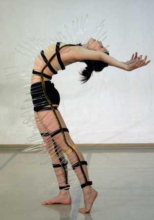 云门舞集2“2008春斗鸟之歌”三月二十六日起将在新舞台一连演出五场,这是云门火灾后第一档公演。图为二月二十五日云门舞者表演编舞家黄翊新创作的“身·音”。(“中央社”图;张皓安摄)