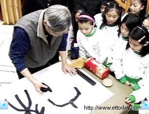 盖上落款,轻松完成“鼠来宝”字帖,刘校长手中的抹布彷佛就像是化身毛笔一般,一笔一划勾勒出汉字的力与美。一旁的小朋友看得目不转睛,抢着上场亲自实验一番。