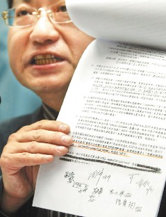 吴育升出示一份华航极机密公文,上面有赵国帅签名。 来源:台湾联合报