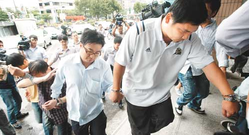 台湾职棒米迪亚暴龙队涉嫌打假球,板桥地检署在侦讯后,暴龙队老板施建新遭到检方饬回,教练吴昭辉(右一)、施建新特助郭德志(右二)等六人遭到收押。(图片来源:台湾《联合报》)