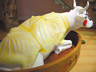 台湾的奔牛节开放创作现场(华山创意园区),最近每隔一段时间,现场就会换上一批花色不同的牛,有时还可看到正在创作的艺术家,如庄普现正创作“三只鹿”,让牛披上了梅花鹿的皮,就有点“指牛为鹿”的味道。洪天宇的牛,内脏器官全部外露。