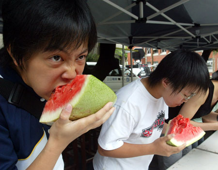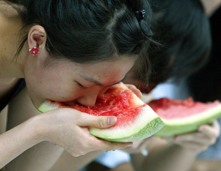 中新网6月5日电 台湾师范大学五日庆祝六十一周年校庆。和往年一样,校庆不能少了西瓜,校内举办“西瓜创意大赏”、吃西瓜比赛,女生组同学不顾形象,大啖演出。