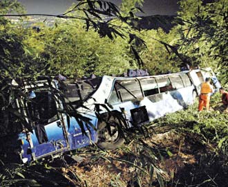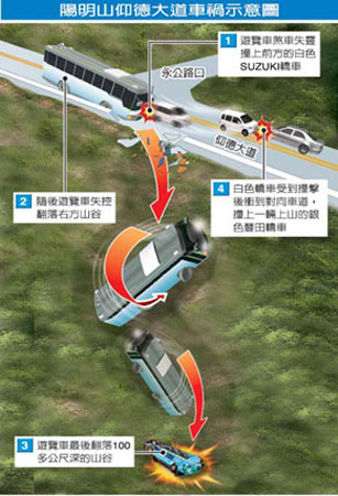 另据台湾《联合报》报道,这辆台湾观光巴士的游览车昨天载着三十四名乘客,傍晚约六点半从阳明山仰德大道下山,驶经永公路口时接连几个碰撞,游览车就翻落一百多米深的山谷。