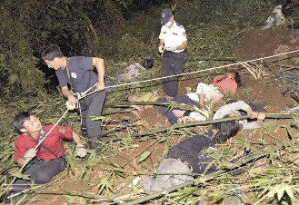 救护人员将伤者固定在担架上,配合路面上的救援人员用力拉,绳索沿线的人轮流将担加往前拉抬,就像拔河似的把担架迅速上传拖上路面;不过有的伤者因担架被灌木或竹子卡住,救护人员只好轮流将他们背上路面送医。