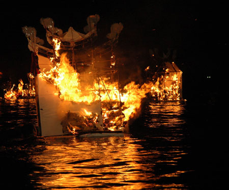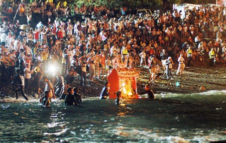 中新网8月27日电 一年一度的鸡笼中元祭今天凌晨在台湾基隆望海巷进行放水灯仪式。在道士诵经祭拜后,各姓氏宗亲会人员陆续将水灯头推入海中,并点燃水灯内纸钱。岸边也同步施放烟火,形成一幅美丽画面。