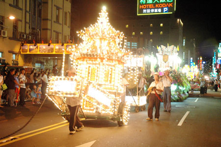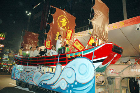 基隆市长张通荣参加整个放水灯仪式,晚十一时,道士开始摆案诵经、烧银纸、放鞭炮,并绕行各姓氏水灯首,仪式相当隆重。