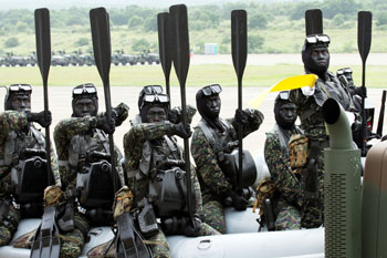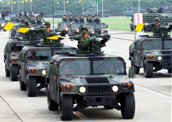 地面分列式中,台陆军更将两部首度亮相的“量产型”云豹八轮甲车编入分列式队伍,而海军陆战队的AAVP7两栖登陆突击车则是2001年美国宣布售台的装备。此外,结合50机枪与刺针导弹的“复仇者”弹炮合一野战防空系统、搭载拖式反装甲导弹的装甲型捍马车,都是首度公开亮相。