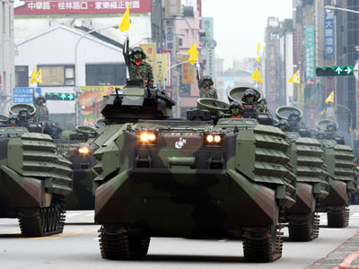 中新网10月8日电 据“中央社”报道,台军“双十庆祝大会”最后一次全程预演今天下午在台当局“总统府”前广场举行,地面部队主要展示台军现役导弹与雷达、通信装备。(郭日晓)