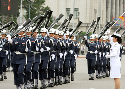 台军三军乐仪队花式操枪表演。