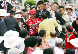 就在周庆峻被“请”出会场没多久,观礼台又出现一名穿着红色旗袍的中年女子。她双手大比倒扁手势,“国安”人员再度出动,想尽快将她带离现场。但这名女子似乎也是有备而来,不顾劝阻,持续比着倒扁手势,还大声咆哮,直到出动女警才将其拉出会场。