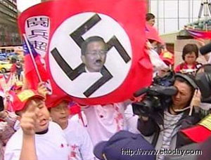 民众拿着特地制作的海报,贴上陈水扁的照片以及希特勒标志,对着海报就是一阵猛打,大喊着:“贪腐的阿扁下台!关起来!不要脸不要脸!”。另外,由于进行交通管制,也让许多赶着上班的民众被警方挡下,急得破口大骂。