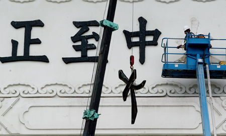 台湾当局拆除中正纪念堂“大中至正”牌楼内外侧共八个字,陈水扁甚至以太监李莲英来比喻:“被割掉了,还能装回去吗?”图为“大”字被拆下时的情况。记者游顺然/摄影