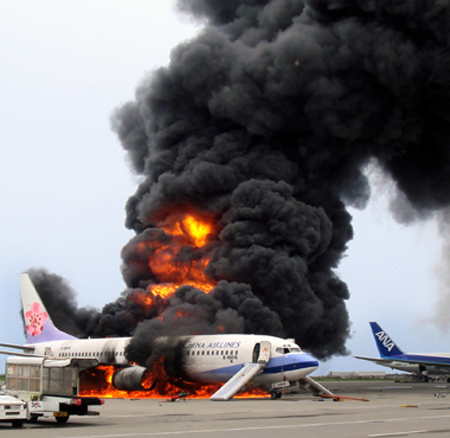 华航在日本琉球那霸机场发生火烧机意外!华航紧急疏散157个旅客,8个机组员也平安脱逃。图为蔡湘雪旅客逃出时所拍的现场华航飞机爆炸画面。记者周文郁/翻摄