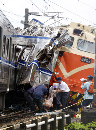 宜兰大里6月15日发生火车撞火车重大事故,试运列车拦腰撞上通勤电车,造成5死16伤,救难人员将车厢中罹难旅客搬出。记者曾吉松/摄影