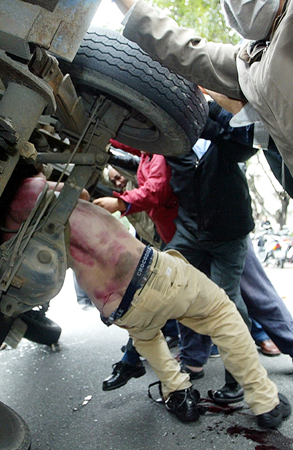 台湾当局强拆“大中至正”匾额爆发流血事件,民众彭盛露涉嫌驾驶小货车疯狂加速撞上东森摄影记者王瑞璋,王送医急救后伤势渐稳定,目前努力复建中。记者侯世骏/摄影