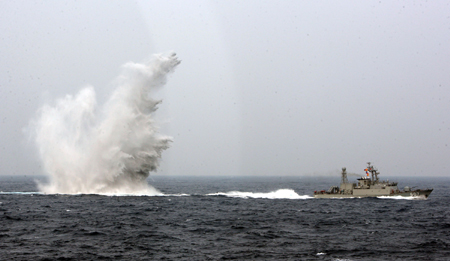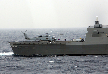台湾海军今天在高雄左营基地举行春节戒备操演,重点加强反潜艇演习,动员了大小总共十六艘各式舰艇与反潜机,执行包括反快艇作战、紧急攻潜、海空协同反潜及空中战力整补,过程相当逼真。“中央社”图 张皓安 摄