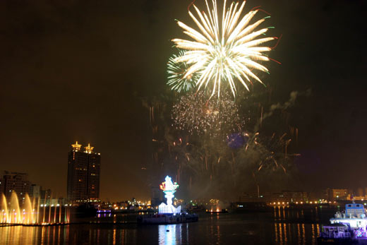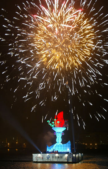 设在高港光荣码头海域的主灯,搭配烟花水舞,璀璨缤纷。(图:台湾《联合报》)