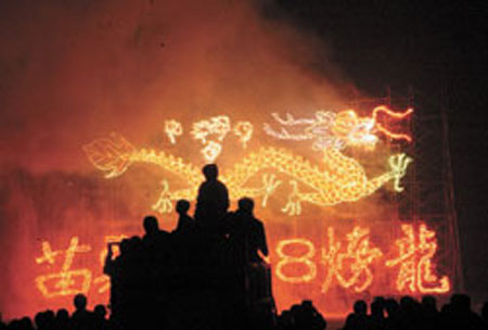 苗栗客家传统元宵活动(火旁)龙,昨晚八点半,由十条龙队排成长龙,在喷泉下演出闯关秀;之后由今年舞龙锦标赛前三名接续上场,表演精采的舞龙技艺。