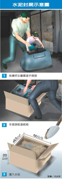 警方押解吴嫌到租屋处挖出水泥块,钻开水泥块后,尸臭四溢。