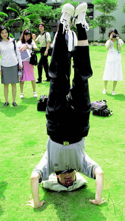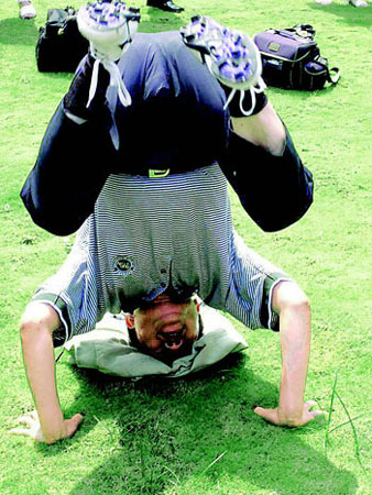 谢长廷“漏网镜头”:脸涂迷彩 大玩倒立(组图)(2)