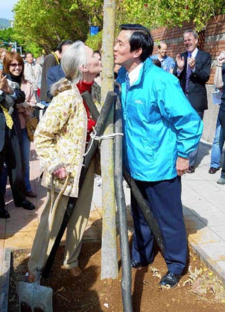 马英九与支持者隔着小树“接吻”,逗乐围观人群。