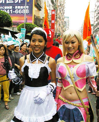 民进党游行队伍中,有年轻辣妹打扮成女仆等装扮,吸引路人眼光。