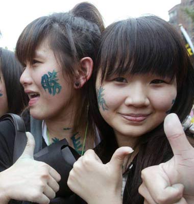 民进党活动上参加活动年轻人在脸上写“胜”字挺谢长廷。 联合报图