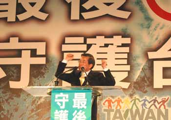 民进党候选人谢长廷20日出席“最后一席、守护台湾”晚会,强调未来的命运交给大家,如果没当选也绝不落跑,会守护台湾。 “中央社”图
