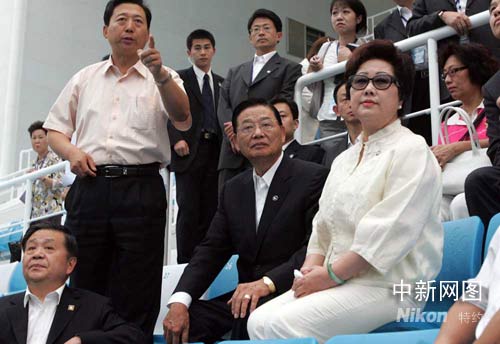 江丙坤在北京奥运场馆“水立方”参观。中新社记者 张宇 摄