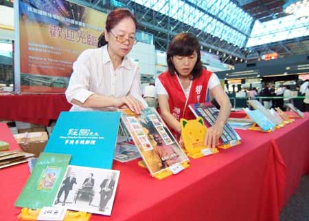 庆祝大陆观光首发团来台,台湾邮政公司四日在桃园机场发行纪念邮票,票面包括马英九、蒋经国等人的肖像。