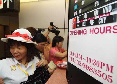 两岸周末包机启动,大陆赴台观光首发团四日揭幕,第一团从广东出发的旅客在抵台桃园机场时,立刻兑换新台币。 “中央社”图