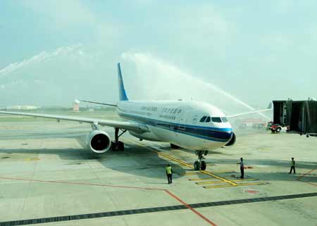 大陆居民赴台观光首发团四日上午搭乘南方航空抵台,揭开两岸交流新序幕。飞机抵台时,受喷水仪式欢迎。 “中央社”图